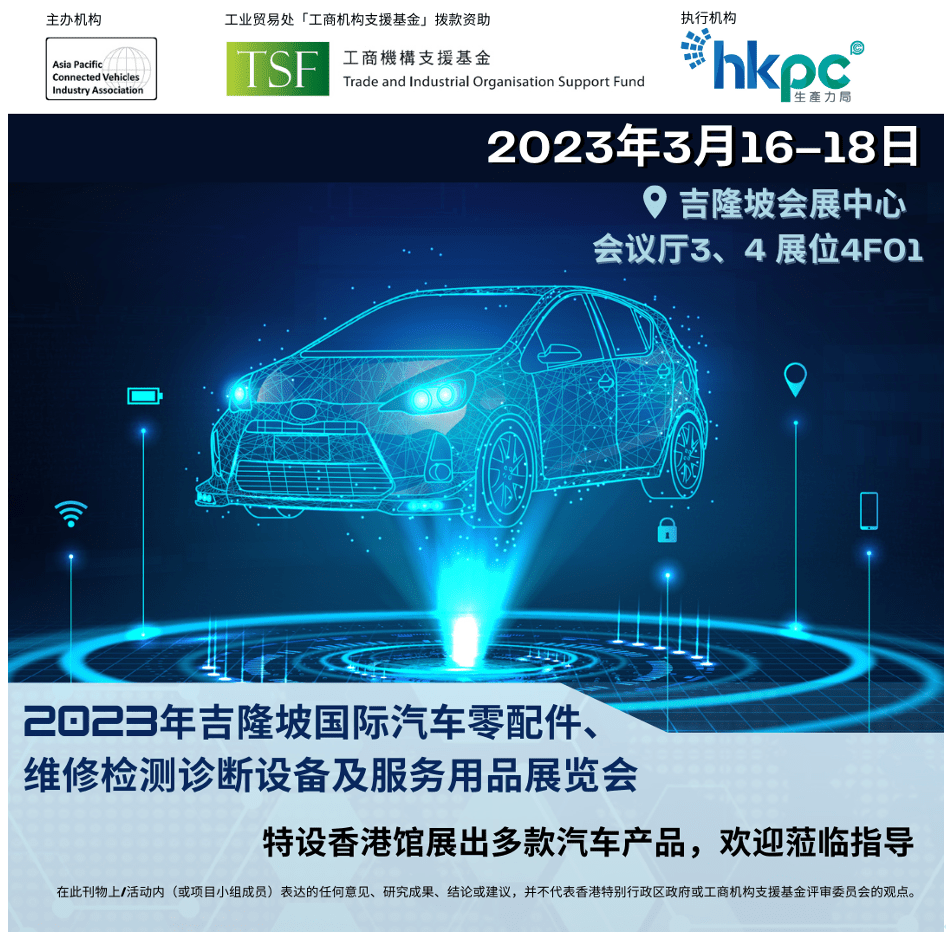 亚太智能网联汽车产业协会联同香港生产力促进局,成功取得香港特别行政区政府工业贸易署「工商机构支援基金」拨款资助参与吉隆坡国际汽车零配件、维修检测诊断设备及服务用品展览会 (Automechanika Kuala Lumpur)。展览将于2023年3月16–18日假吉隆坡会展中心举行。展览馆中将设立「香港馆」及于展览期间举办业务对接会欢迎踊跃报名,旨在共同推广香港智能汽车产业,扩展商机,推动整体香港汽车产业市场的发展! 现诚邀各位邀请客户/业界合作伙伴参与是次的展览。