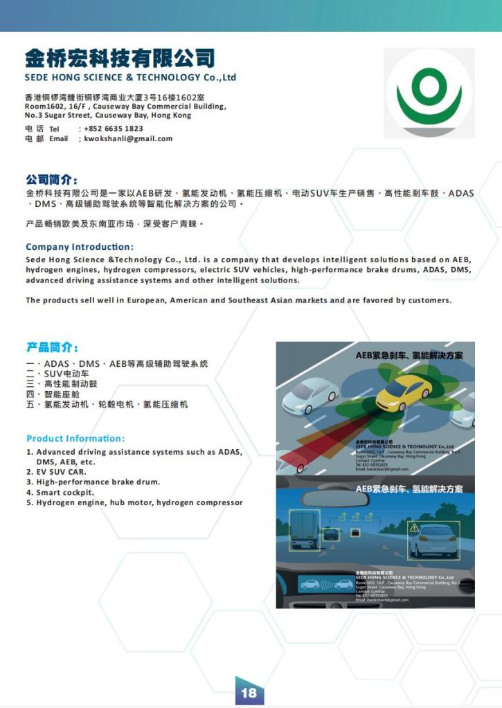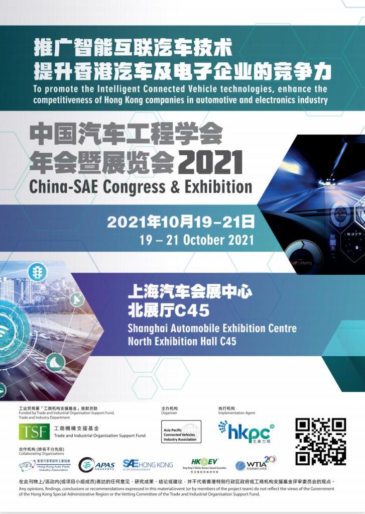 2021中国汽车工程学会年会暨展览会(SAECCE),展览日期: 2021年10月19-21日地点:上海市嘉定区安亭镇博园路7575号 上海汽车会展中心。 展览馆中将设立 “香港馆”及举办业务对接会论坛欢迎踊跃报名,旨在共同推广香港智能汽车产业,扩展商机,推动整体香港汽车产业市场的发展! 现诚邀各位 邀请 客户/业界合作伙伴参与是次的展览,对接会论坛安排在10月20日下午13:30至18:00,位于上海汽车会展中心马路对面(步行5分钟到达)上海清枫酒店宴会厅召开,敬请莅临指导。