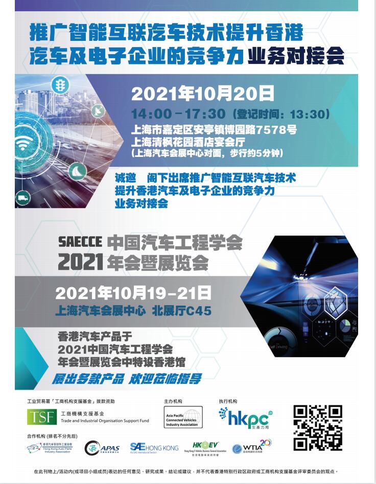 本次年会,SAECCE将联同亚太智能网联汽车产业协会及香港生产力促进局组织相关展团,邀请了20家香港汽车智能网联相关企业参展。如香港汽车科技研发中心、亿逹动力科技有限公司、启荣电子软件开发有限公司、新灵电子技术开发有限公司等,与此同时,为了进一步推广智能互联汽车技术提升香港汽车及电子企业竞争力,10月20日下午14:00-17:30还将召开业务对接会。敬请期待!
