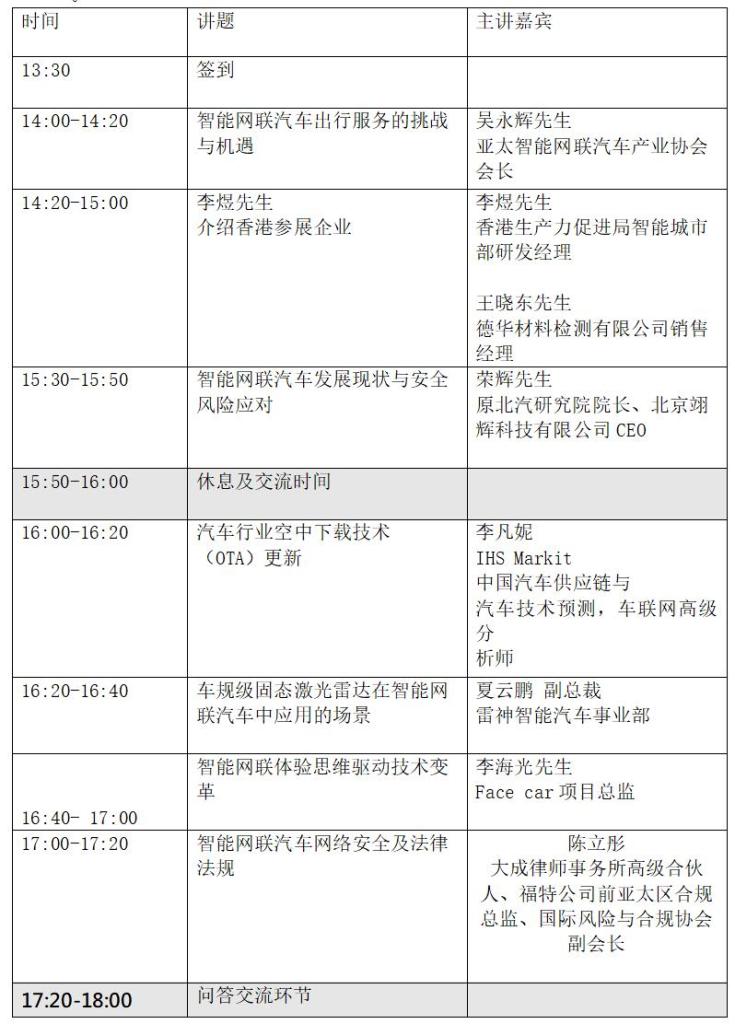 为共同推广香港智能网联汽车产业,扩展商机,推动整体香港汽车产业市 场的发展,组织企业参加 2021 中国汽车工程学会年会暨展览会(SAECCE),展 览馆中将设立”香港馆”及举办业务对接会论坛。 在香港工商机构支援基金(TSF)的资助下,亚太智能网联汽车产业协会联合 香港生产力促进局、汽车科技研发中心及中国汽车工程学会举办是次的业务对 接会,并由北京利他国际展览有限公司承办。在是次的对接会中, 我们亦邀请 20 家香港汽车相关智能网联、无人驾驶、车联网等企业参加。 举办时间:2021 年 10 月 20 日下午 13:30 至 17:30, 地点:上海市嘉定区安亭镇博园路 7578 号上海清枫花园酒店宴会厅 欢迎踊跃报名!