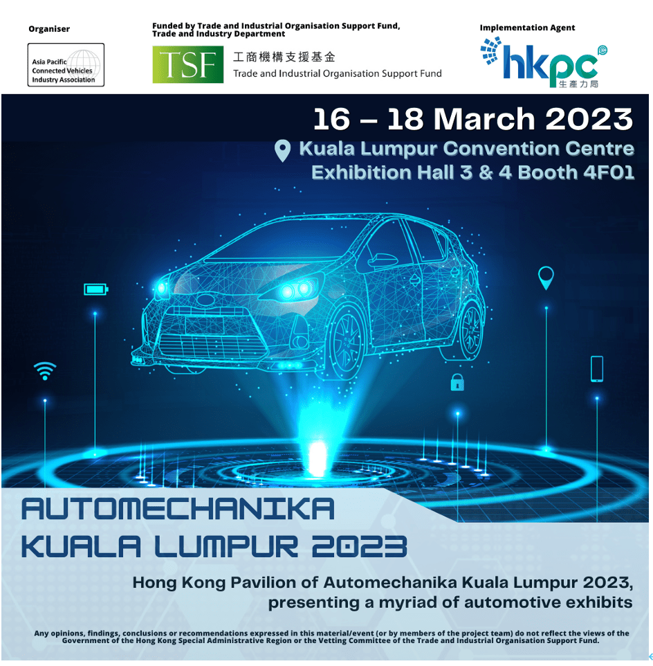 亚太智能网联汽车产业协会联同香港生产力促进局,成功取得香港特别行政区政府工业贸易署「工商机构支援基金」拨款资助参与吉隆坡国际汽车零配件、维修检测诊断设备及服务用品展览会 (Automechanika Kuala Lumpur)。展览将于2023年3月16–18日假吉隆坡会展中心举行。展览馆中将设立「香港馆」及于展览期间举办业务对接会欢迎踊跃报名,旨在共同推广香港智能汽车产业,扩展商机,推动整体香港汽车产业市场的发展! 现诚邀各位邀请客户/业界合作伙伴参与是次的展览。